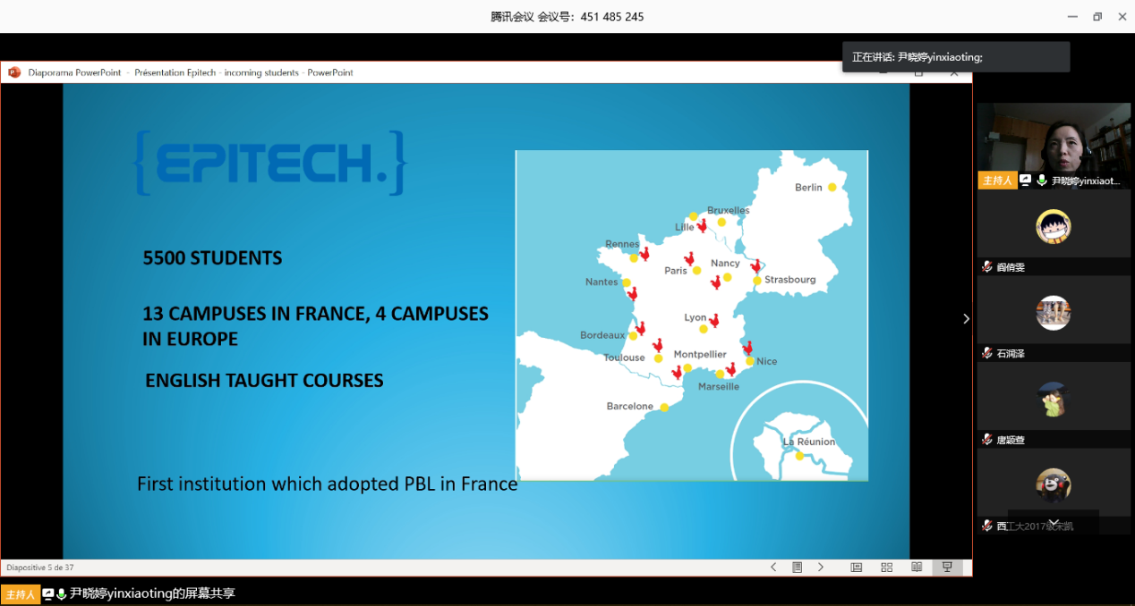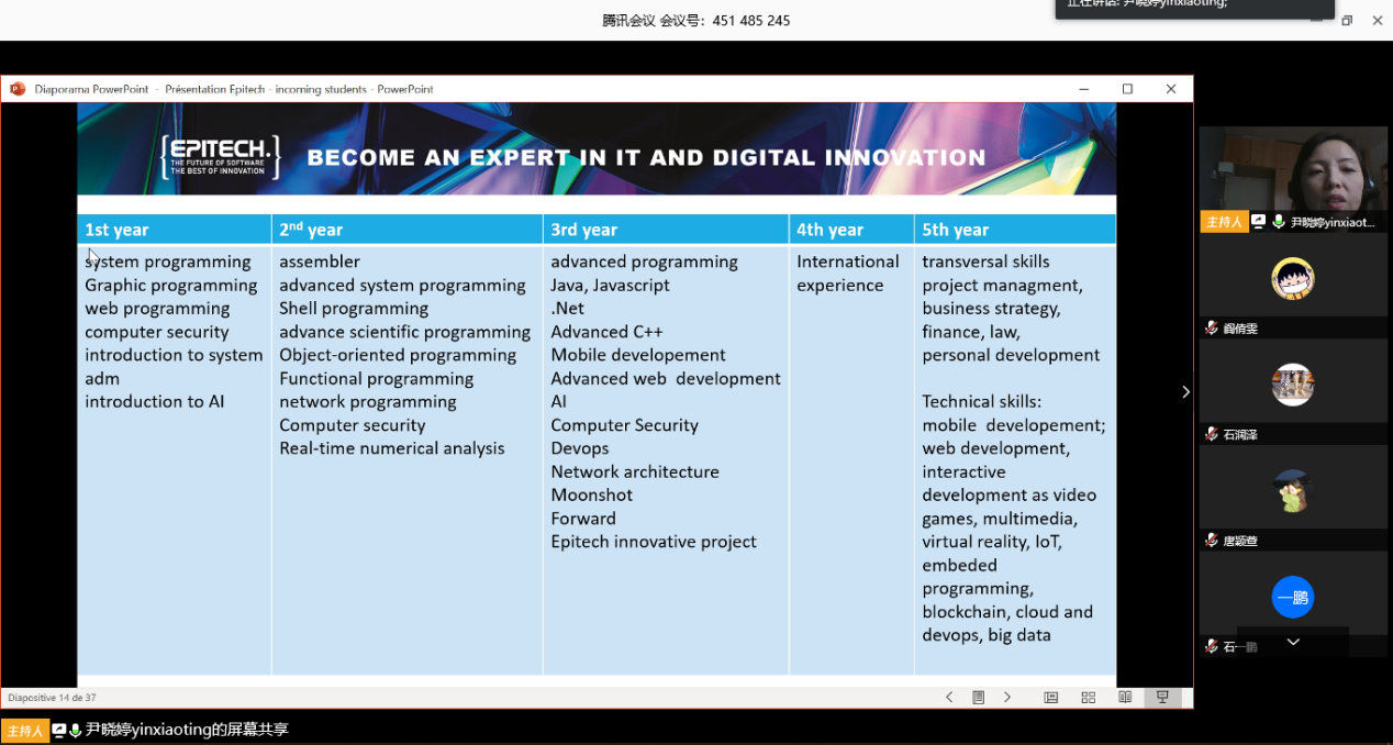 首先,尹老师向大家介绍了EPITECH(European Institute of Information Technology), 法国计算机及新技术学院, 又称欧洲理工学院, 于1999年建立,是法国最大的计算机软件信息专业学校. 该校在法国12座城市设有分校,采用独创的以项目/问题为主导的教学模式, 以其独一无二的模式和众所公认的专业化程度,培养未来的行业专家、创新者和真正的项目主导者。为那些热爱信息技术行业,期望成为创新世界的主导者提供走向成功的平台。