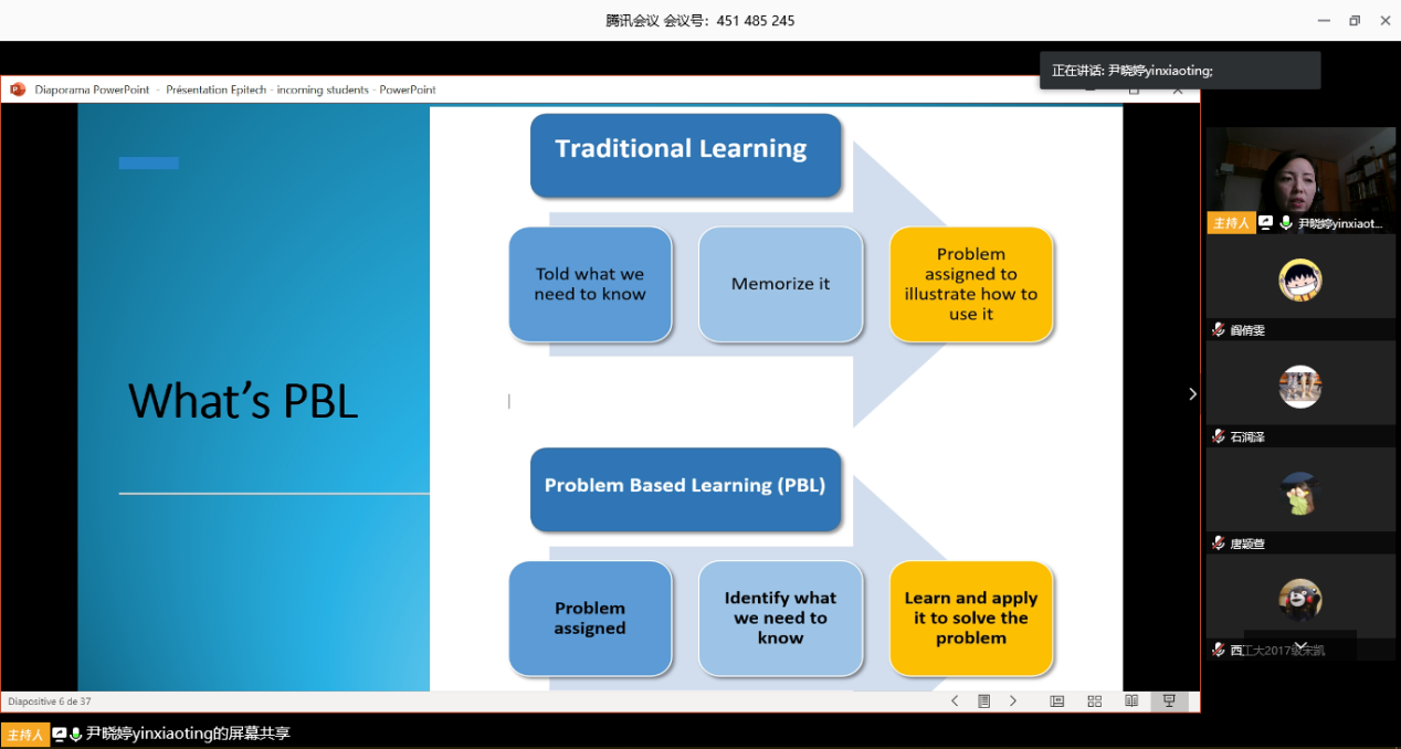 、计算机学院等学院的部分学生参加了本次线上宣讲会。尹老师在法国从事计算机软件专业的国际教育合作多年,曾就职于中国驻外使馆经济商务处,并获得法国MBA工商管理硕士,对PBL (Project-based Learning) 教育模式与教学创新有深刻的认知,具有丰富的国际教育合作经验。