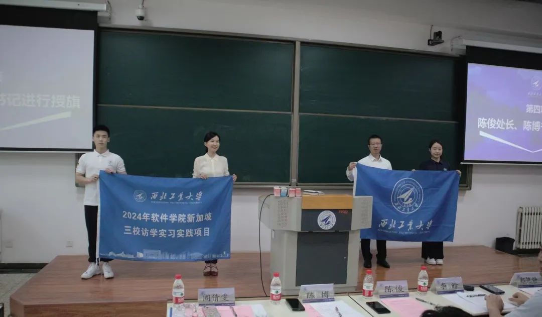 仪式的最后,陈俊、陈博分别向带队老师阎倩雯、学生代表张昊鼎授旗。这两面旗帜不仅承载着期望,更是责任的象征。师生们将在新加坡的顶尖学术殿堂内,深耕知识,开阔眼界。