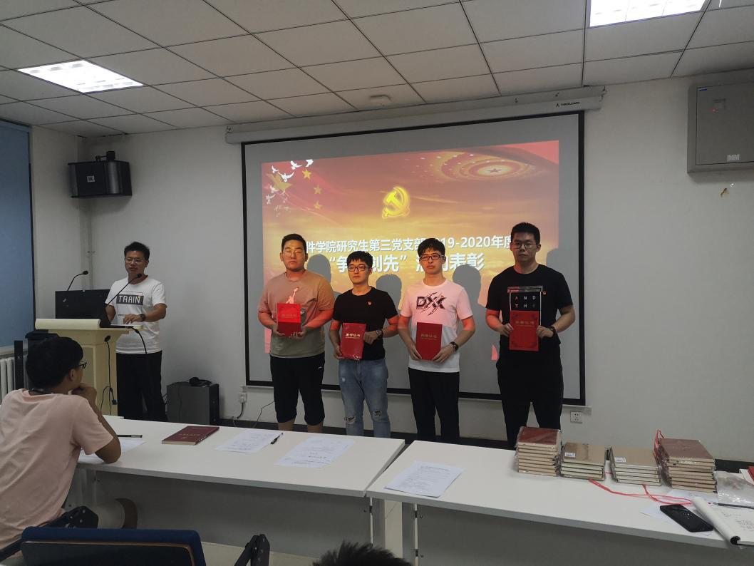 支委工作述职完后,与会党员同志对支部年度整体工作进行民主评议。而后,支部开始进行2019-2020年度“争优创先”评选表彰。“争优创先”活动旨在树立学生党员、党小组模范典型,引导学生党员、党小组更好牢记和践行初心使命。通过前期个人申报、党小组初审推荐、支部审查评选,共评选出14位同志为“优秀学生共产党员”,2个党小组为“先进党小组”。而后,胡轩豪同志、梁奕桢同志代表支委会向获奖的党员同志和党小组进行荣誉证书和奖品的颁发。以上获评党员个人和党小组“始终把人民放在心中最高的位置,始终全心全意为人民服务”,同时立足专业学科,坚持全面发展,给其他同志树立了良好榜样。青年的思想愈被榜样的力量所激励,就愈会发出强烈的光辉,与会的同志们也表示要多向榜样学习,更好提升自己的党性修养和综合素养。