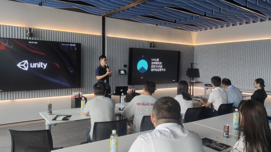 在Unity总部,公司负责人首先带领来访教师与同学参观了企业研发平台,对实时三维技术应用前景和Unity工业案例进行了介绍。Unity是全球实时3D内容创作和运营平台,目前Unity主要运用在游戏、汽车、运输、媒体和娱乐、建筑工程和建造等领域。用Unity实时3D平台制作的游戏和体验已在全球范围内覆盖30亿台设备,并且在过去一年的安装量已超过330亿次。