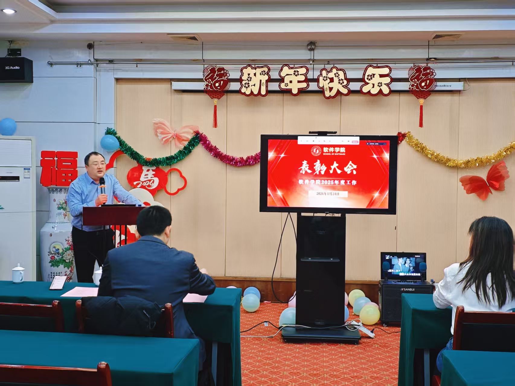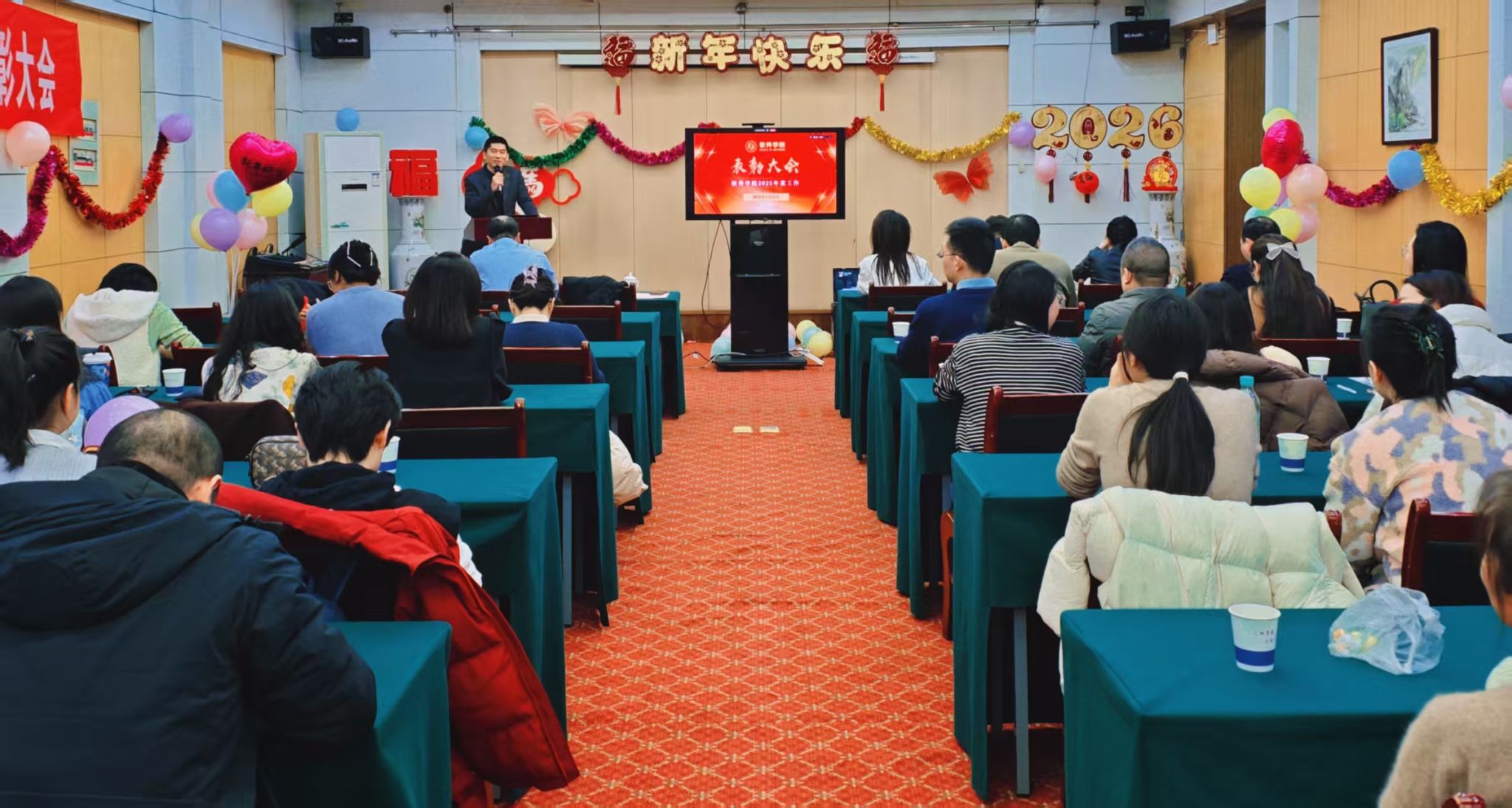 年终表彰名单。一批批在人才培养、科学研究、人事人才、管理服务等岗位上表现突出的先进集体和个人受到表彰。这不仅是对过去一年辛勤付出的肯定,更是对未来再创佳绩的期许。郑江滨勉励大家,2026年是“十五五”开局之年,对照核心任务,要继续保持“永远在一线、永远在状态、永远在前列”的工作作风,携手并进,接续奋斗,共同谱写学院发展的新篇章。
