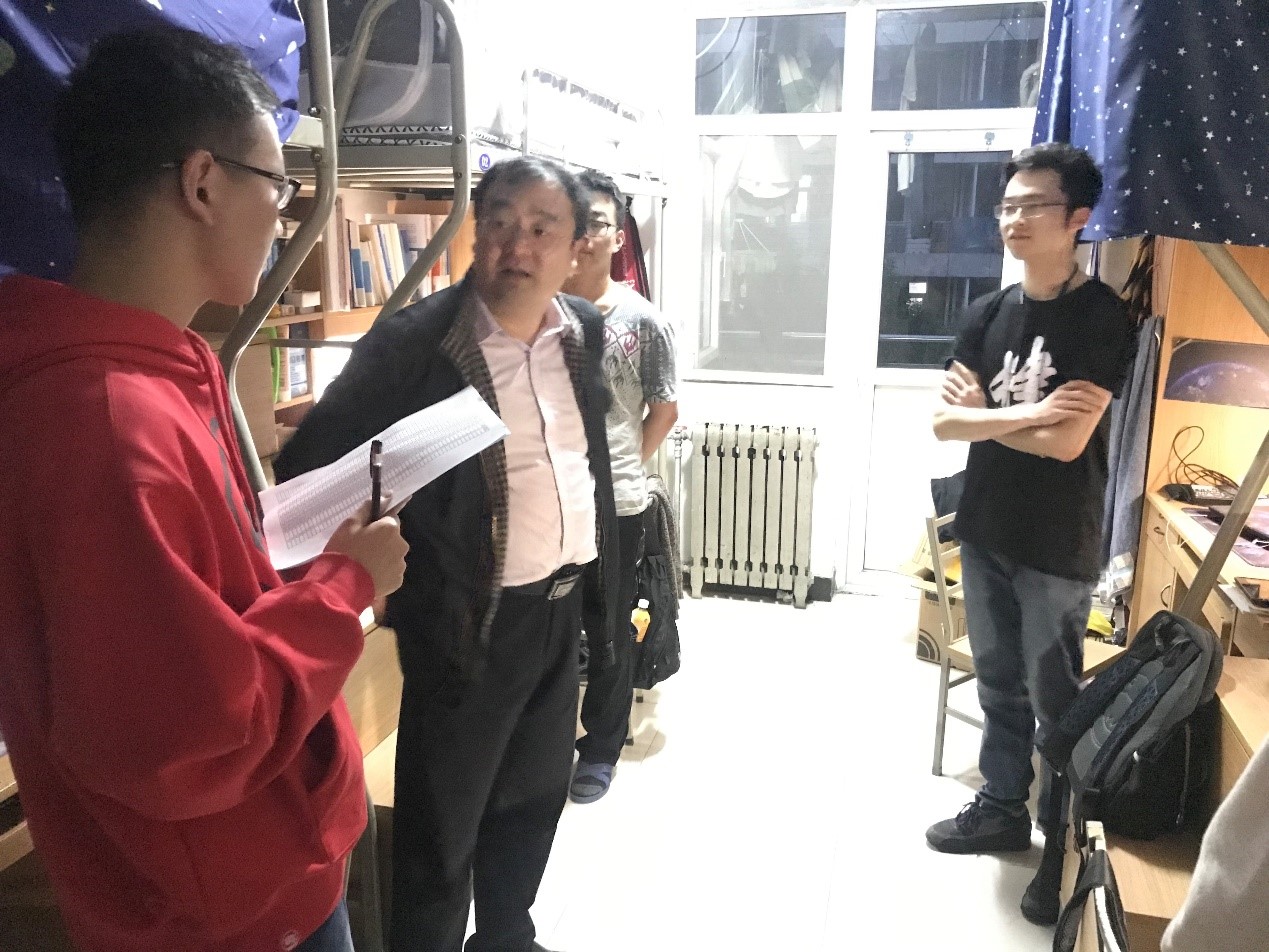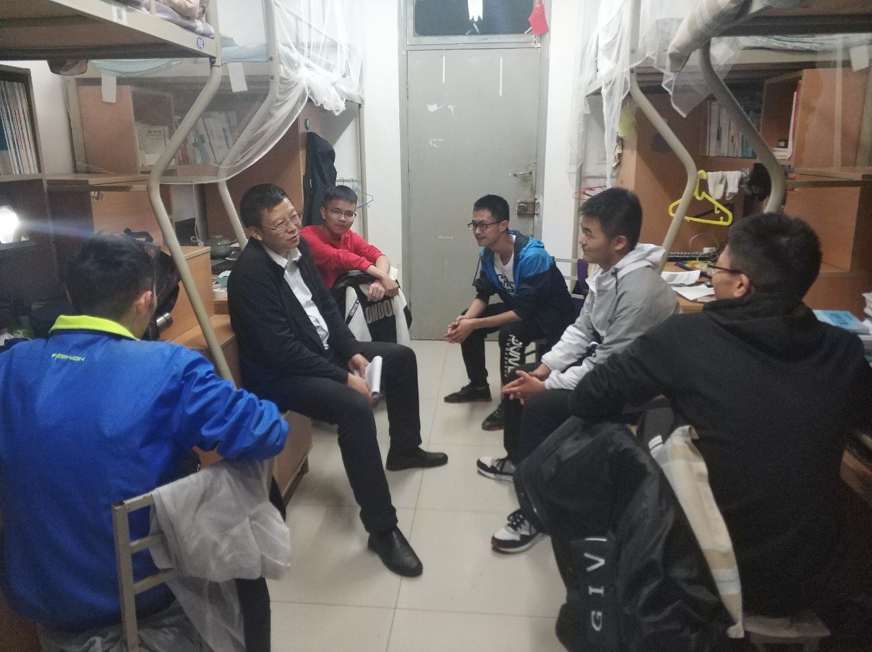 5月3日,郑江滨走进云天苑D座学生宿舍。和同学们聊了选课情况、数模比赛参赛情况、学习和生活中遇到的困难,要求大家要做好自己大学的学习规划,学好专业知识,培养自己解决问题的能力,发展兴趣爱好,不断提升自己。郑江滨还叮嘱同学们要走出宿舍去教室自习、去操场锻炼,好好学习的同时更要保护视力,重视身体健康,同学们也对老师的关心表示了感谢。