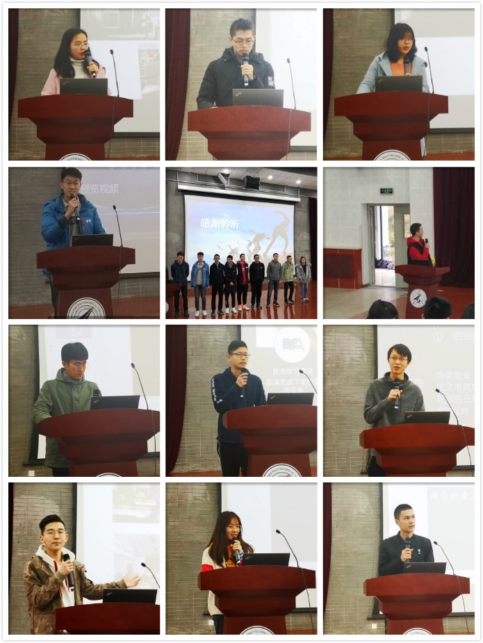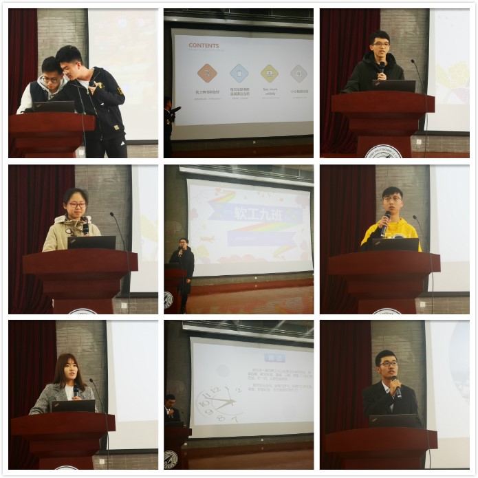 首先,软件二班班长主持了本班述职答辩。班内学习、心理、体育及宣传委员作为班委代表轮流答辩。详细介绍了软件二班在早晚自习、班级聚会、体育比赛等方面的活动和工作。随后,伴随着软件七班副班长风趣的开场,班级全体班委依次登场,分别介绍了各自的工作情况,并由班长进行总结。多角度阐述了班级在学习、生活、体育及文艺等多方面充实有序的工作事宜。而对于未来,班委也是充满想法,饱含信心。接着,软件三班的班长、副班长就班级活动和工作进行了汇报,简明扼要地阐释了上学期班级建设的经验和教训,班级未来可期。然后,软工一班班长、学习和体育委员着重对班内学习与体育进行答辩。介绍了班级期中成绩不理想,经过班委与同学的努力,在期末缔造逆袭奇迹的经历,令在同学们心生钦佩。