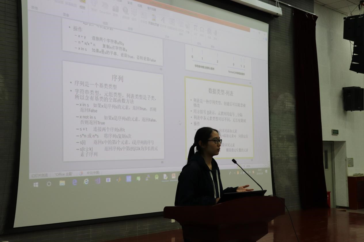 第一堂课的主讲人为软件与微电子学院2017级本科生、足球基地人形组成员、软件协会项目部部长丁越,她为我们讲解了Python的基础入门课程。