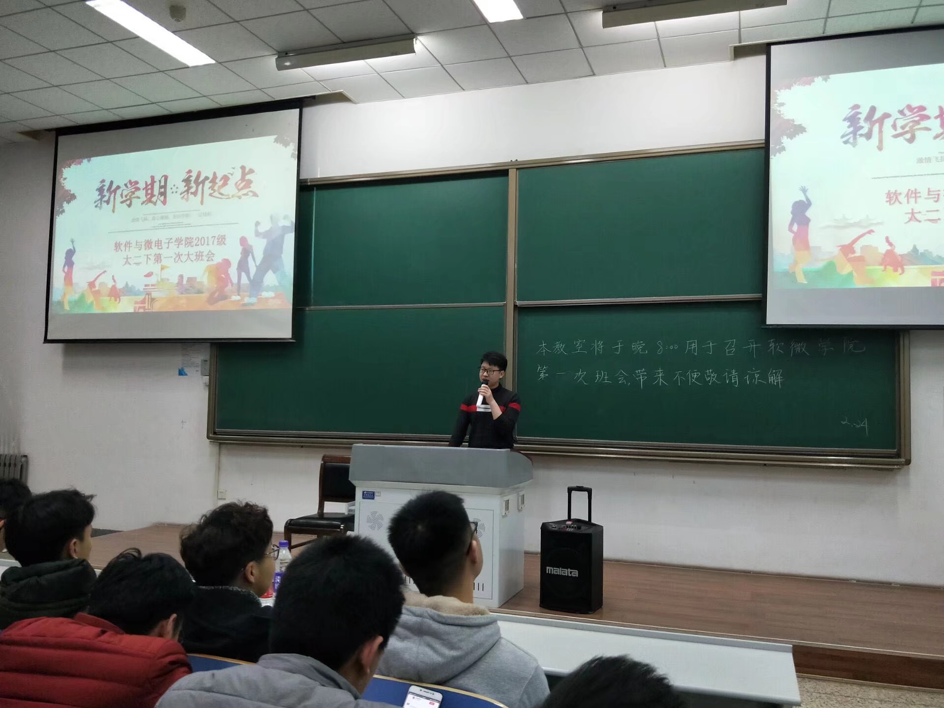 新春伊始,万象更新。经过了一月有余的寒假,踏着春的脚步,我们又回到了美丽的校园,准备开启一个崭新的学期。2019224日晚2000,软件与微电子学院2017级本科生新学期第一次大班会于教学西楼D102正式召开,本次大班会有2017级辅导员陈智通老师主持,大会以“独梦寒窗倚栏处,正是风起云涌时”为主题,全体同学积极参加。