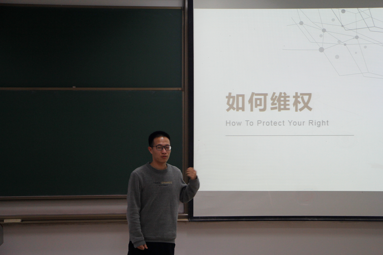 学生会权益部部长宋晋为大家科普大学生关于权益及维权的基本知识,介绍维权渠道,讲解维权方法,让每位同学深入了解。