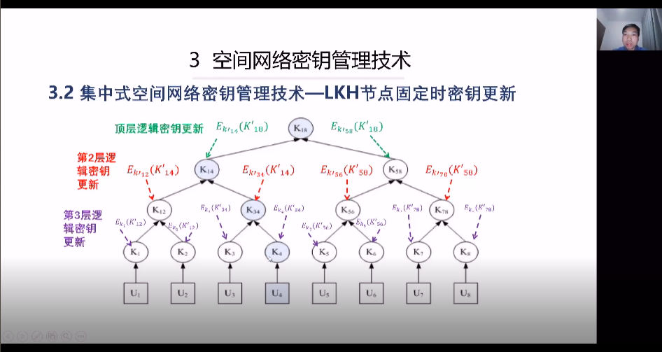 在讲到空间网络密钥管理研究现状时,刘老师对集中式、分布式以及分簇式三种结构的优缺点和适用范围进行了说明,由此引出了该项技术在目前国内外研究中仍旧存在的问题。接下来向我们详细讲述了空间网络密钥管理的关键技术——LKH,这种技术使用户只需要保存从自身到根节点路径上的密钥,之后便可以与任何节点通讯。通过刘老师的讲解,大家充分了解到该项技术背后的原理。