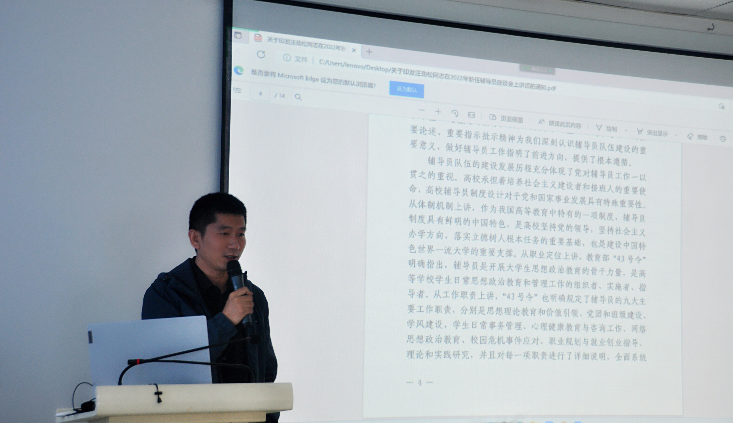 张龙表示,此次培训工作是进一步贯彻落实学校关于辅导员队伍建设工作的具体措施,是进一步提升学院辅导员队伍教育实践能力的具体行动,希望大家聚焦提升业务能力和水平,聚力做实做好学生工作,确保培训有收获、学习有成效、交流有启发,为学院辅导员队伍建设和学生工作的开展增能助力。