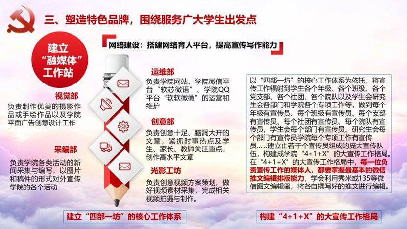本年度成立学院融媒体工作站,建立“四部一坊”的核心工作体系和“4+1+X”的大宣传工作格局,不断培养更多有能力、有责任感的媒体人;