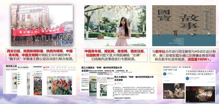 学院牵头的“单车随手扶,城市更温暖”活动还得到西安日报、陕西新闻联播、陕西传媒网、中国青年网、中国文明网的联合报道,受到了社会的广泛好评;学院硬核“女神”白雨桐先进事迹被中国青年报、搜狐网、青塔网、西安日报、校园教育刊登文章,进行专题报道;学院与新华社合作进行国宝解密与H5动态设计制作,在国宝中寻找丝路文化密码,“国宝故事”唐三彩骆驼载乐俑以及唐镶金兽首玛瑙杯在新华社宣传报道,浏览量高达100W+。