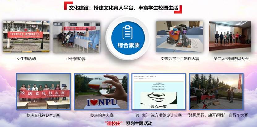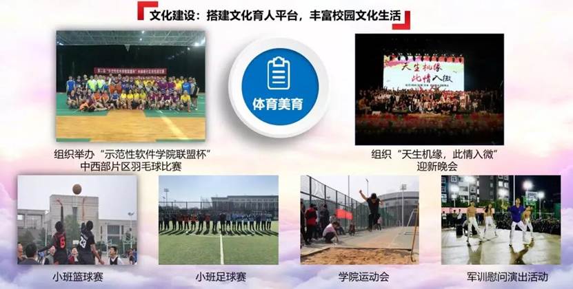 软芯微语-学院搭建文化育人平台不断丰富学生校园文化生活 学院团委指导学生会、社团、团支部针对“综合素质”“专业技能”“体育美育”三个方面开展丰富多彩的校园文化活动。 在提高学生综合素质方面成功举办校园诗词大会、校庆文化衫设计大赛等8项活动;在提升学生专业技能方面成功举办校园“debug”大赛、Python校园公开课等15项活动;在做好学生体育美育服务方面,成功举办“示范性妖精动漫