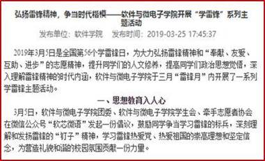 学院搭建服务育人平台不断助力学校脱贫攻坚工作 学院利用微信公众号“软芯微语”发起一份倡议,鼓励同学争当学习雷锋的标兵,为营造礼貌和谐的校园氛围贡献一份力量,并从“思想教育入人心”、 “美化校园点滴行”、 “环保捐赠献爱心”、“社会服务公益行”四个方面开展弘扬雷锋精神,争当时代楷模 “学雷锋”系列主题活动,组织团支部进行了校园环境美化、电脑志愿维修、单车整齐摆放、旧书爱心传承等活动,同时在东大彩色童年幼儿园开展“大手拉小手”主题团日活动,同学们教唱《学习雷锋好榜样》,深情讲述雷锋故事,展现新时代大学生积极向上的精神风貌。