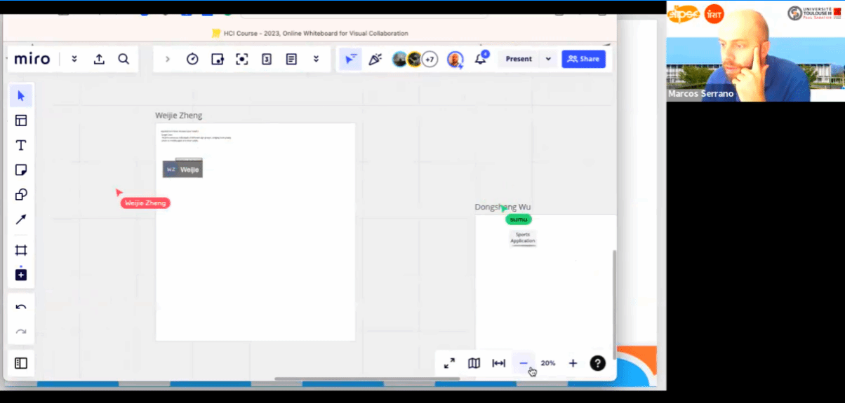 本次课程是Marcos教授首次面向妖精动漫 的学生授课。在正式开课之前,Marcos教授先向同学们做了自我介绍,然后以学术汇报的形式向大家简要介绍了他最近的科研成果。教授全程通过miro平台与学生们进行互动,了解了同学们的专业方向以及对人机交互的认识,以此作为本次人机交互课程的引入。
